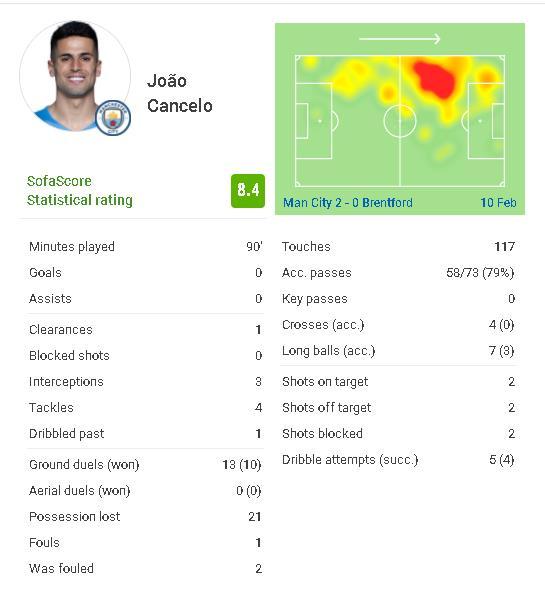 本轮英超,曼城主场2比0战胜布伦特福德。赛后SOFASCORE的评分中,坎塞洛获得的分数最高,达到了8.4分,尽管他本场比赛没有进球,也没有助攻。